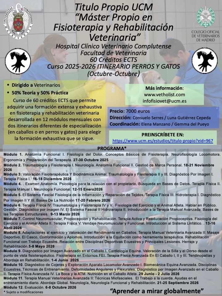 En este Máster Propio UCM de un curso académico de duración (de Octubre-Noviembre hasta Octubre año siguiente) y 60 créditos ECTS permite adquirir una formación extensa y exhaustiva en fisioterapia y rehabilitación veterinaria desarrollada en 12 módulos mensuales con dos itinerarios diferentes de especialización (en caballos o en perros y gatos) para elegir la formación exhaustiva que se sigue.